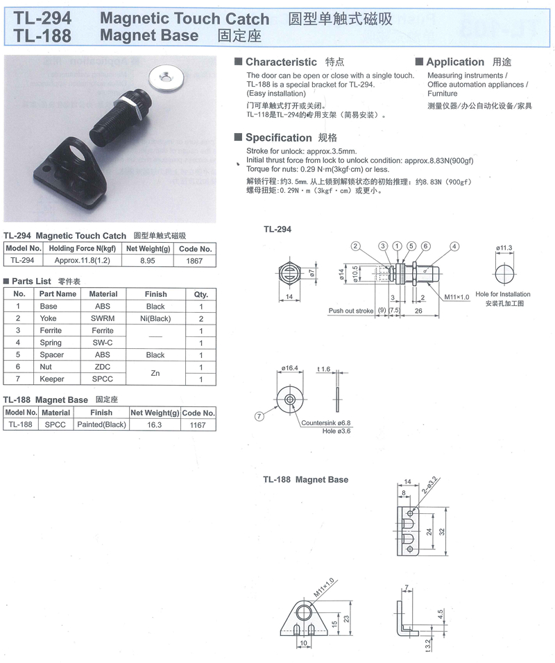 名称:TL-294 圆型单触式磁吸 TL-188 固定座