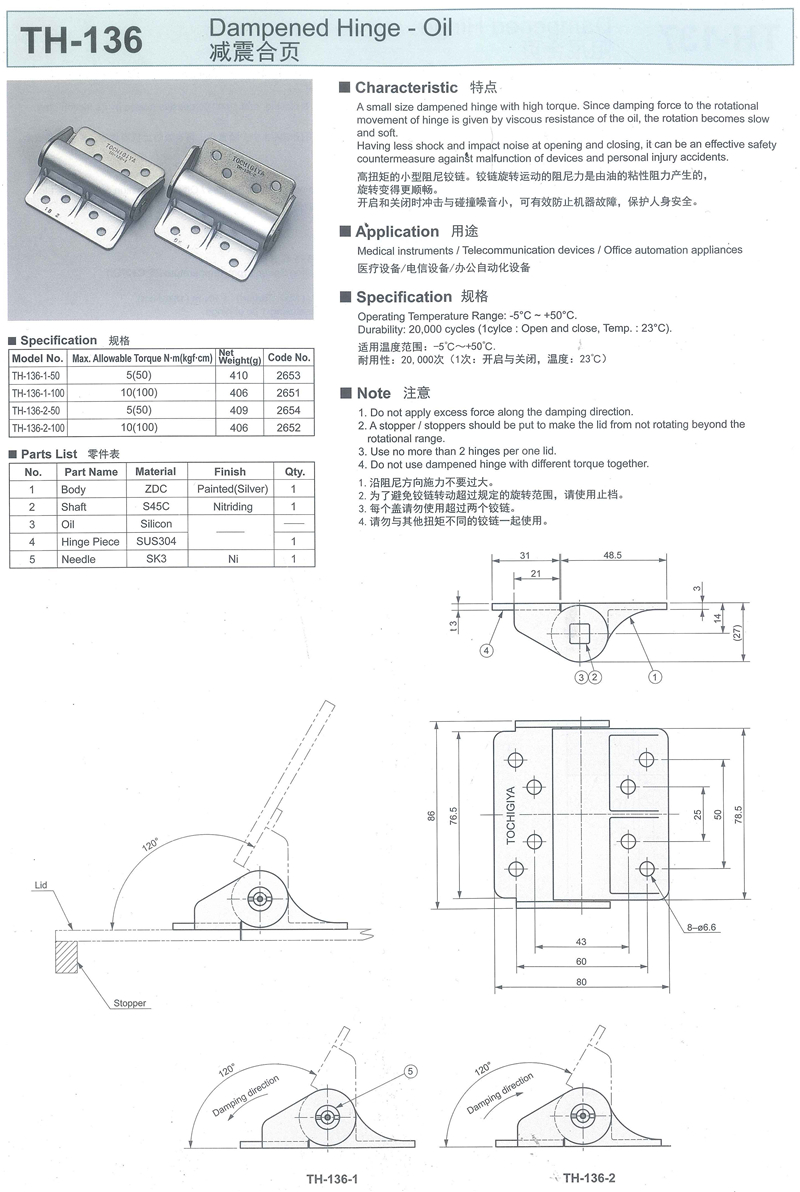 Tochigiya 枥木屋 TH-136 减震合页 TH-136-1-50 TH-136-1-100 TH-136-2-50 TH-136-2-100
