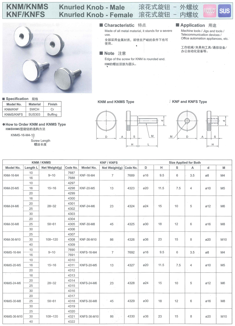 Tochigiya 枥木屋 KNM/KNMS 滚花式旋钮-外螺纹 KNF/KNFS 滚花式旋钮-内螺纹